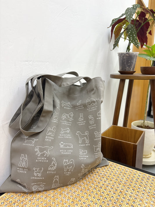 世界圖鑑系列 : 小狗家族淺灰色帆布Totebag * [預購貨品,下單後14天出貨]