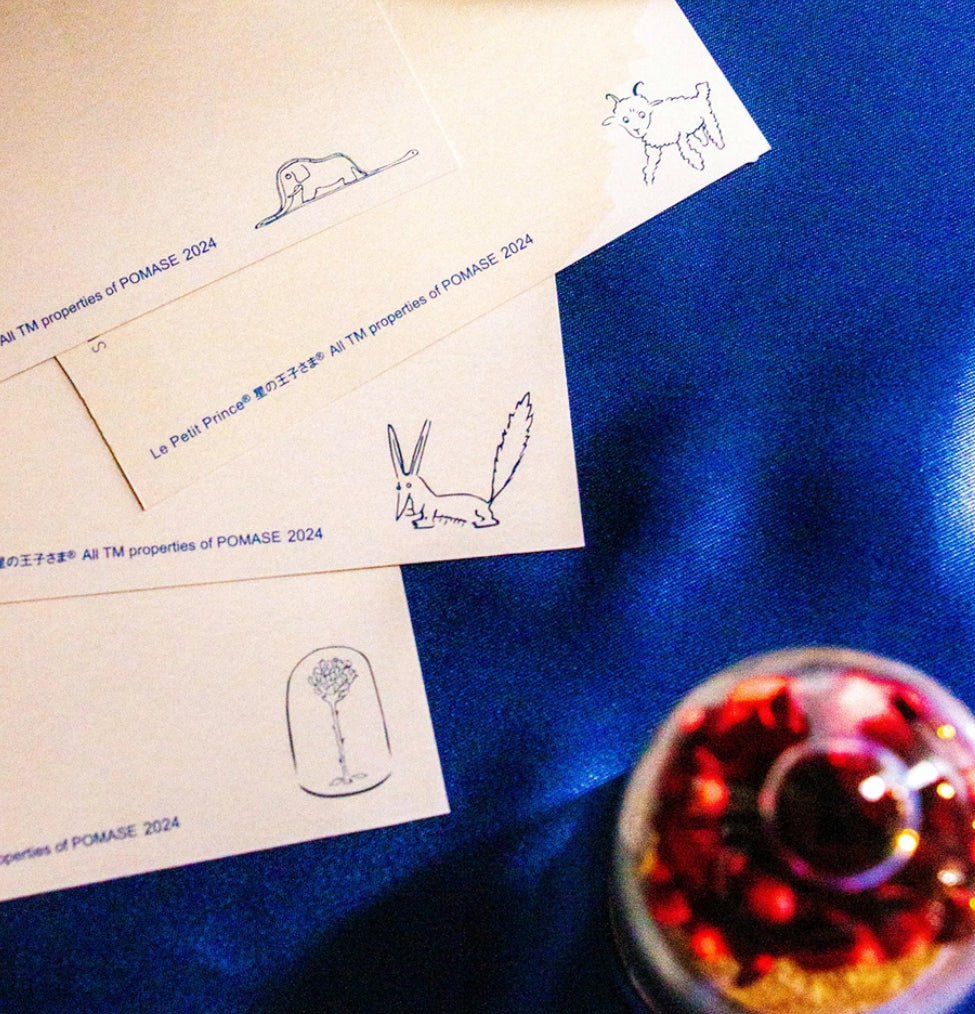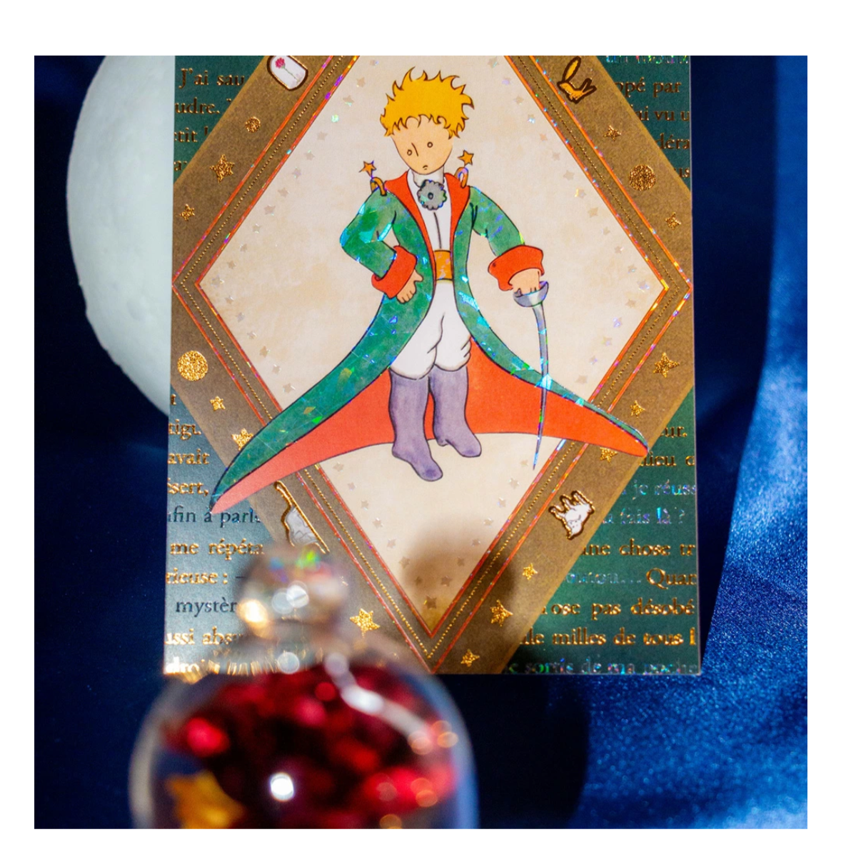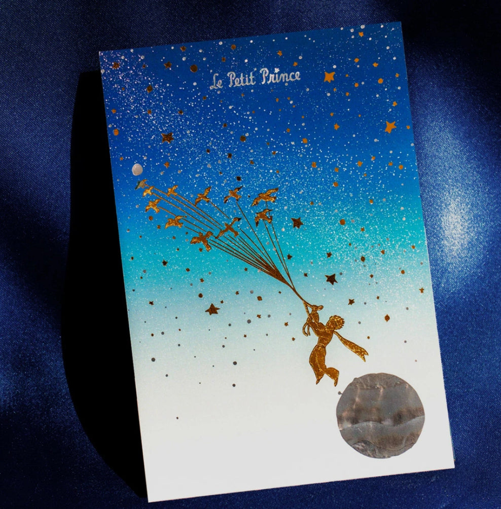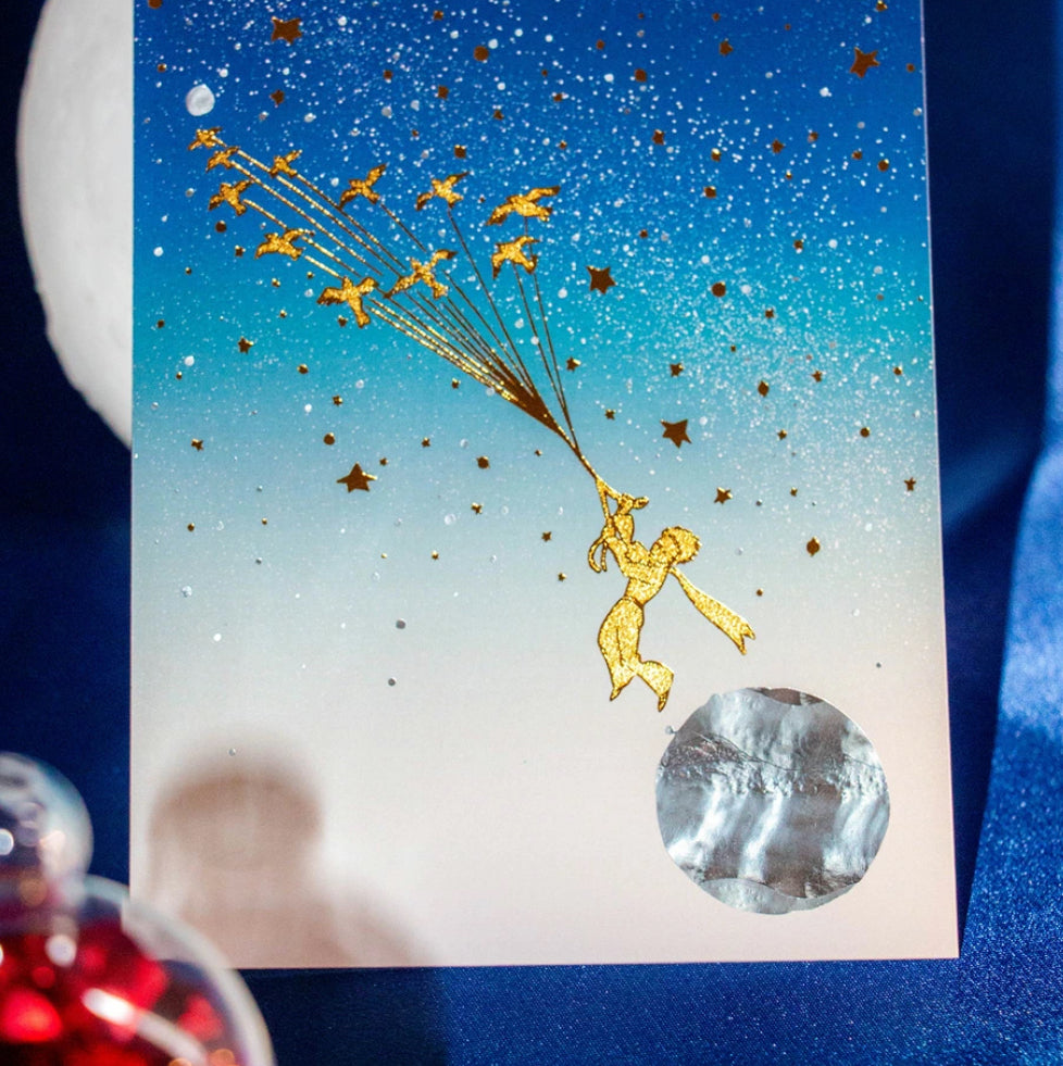 以小王子的大冒險為主題的燙金明信片。在印刷品上大量疊加了金、銀箔,表現了宇宙一面的星星的光芒和玻璃的閃光。