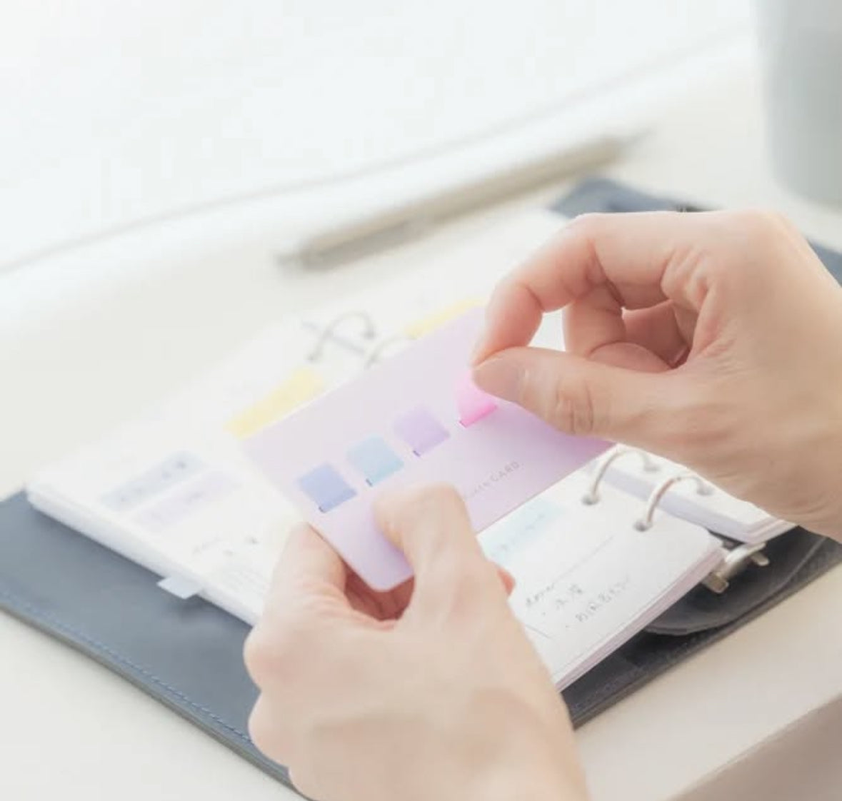 破天荒的便攜設計,一張卡片設有5個抽出式的標示貼。而且放在筆記簿的封面套或是筆袋都不佔位。