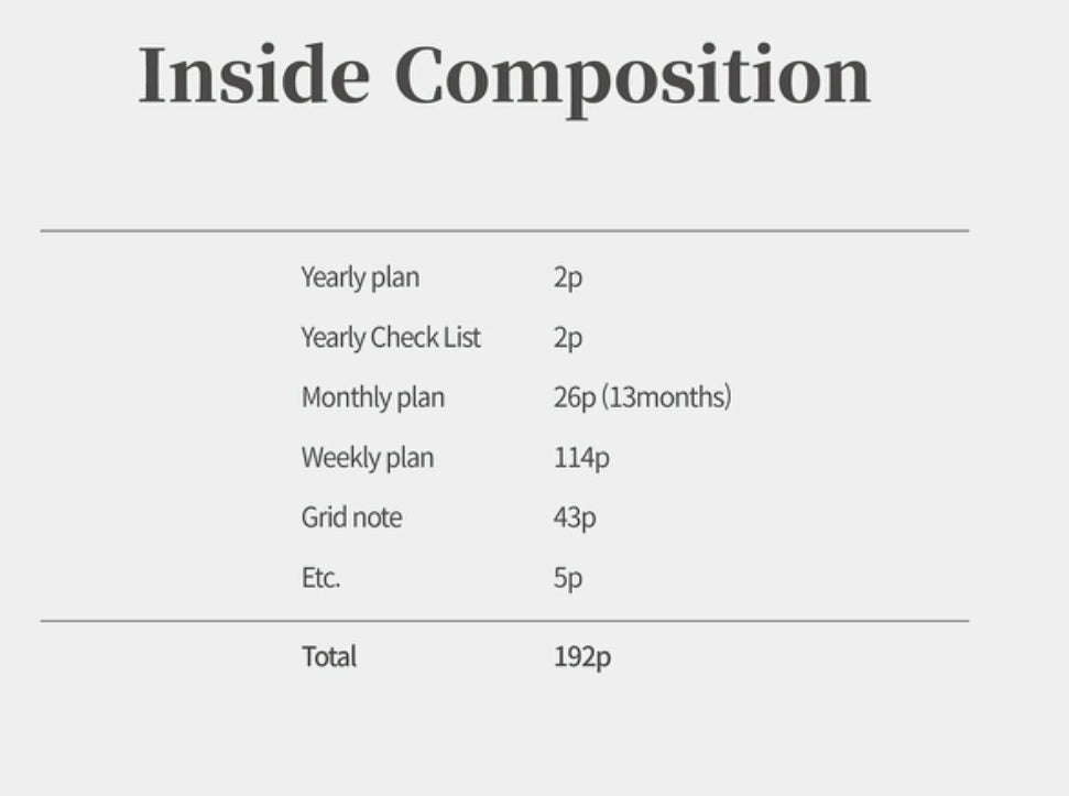 內頁: 一共192 頁 (Yearly Plan 2 頁,Monthly Plan 26 頁,Weekly Plan 114 頁,Free Notes 43 頁)