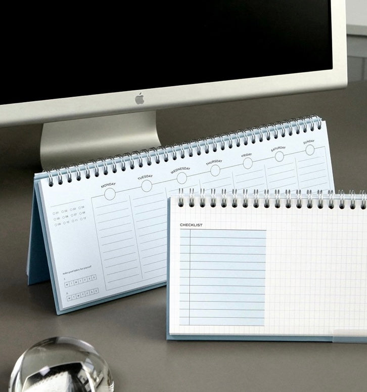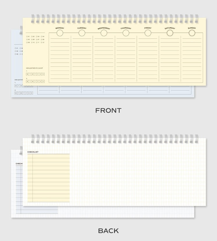 Weekly Table Log 長形方便置於螢幕下面,可立式更適用於有限的辦公桌空間。前後分別是記下議程的Weekly Log,以及check list + 方格free note,實用率100%!