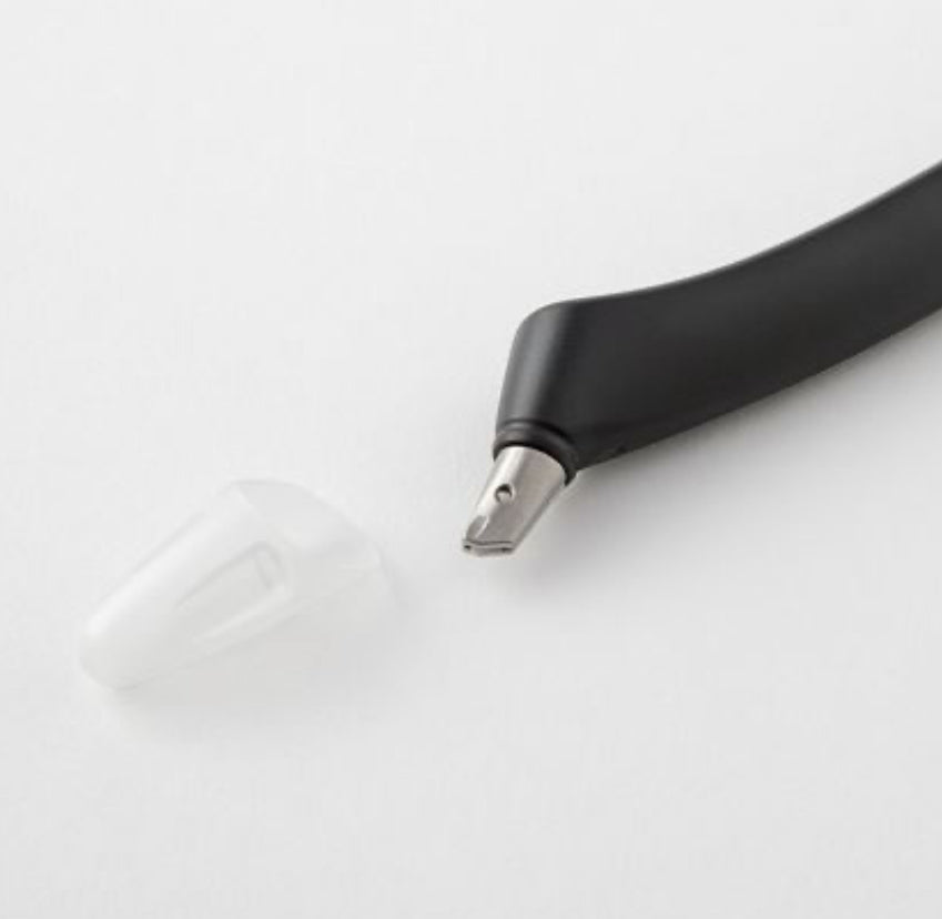 刀頭為鋒利的陶瓷刀片,陶瓷刀頭極為鋒利,平時請套蓋,使用時可以將蓋至於尾端,為取得最佳使用效果,請務必讓刀頭與紙面成 90 度垂直。