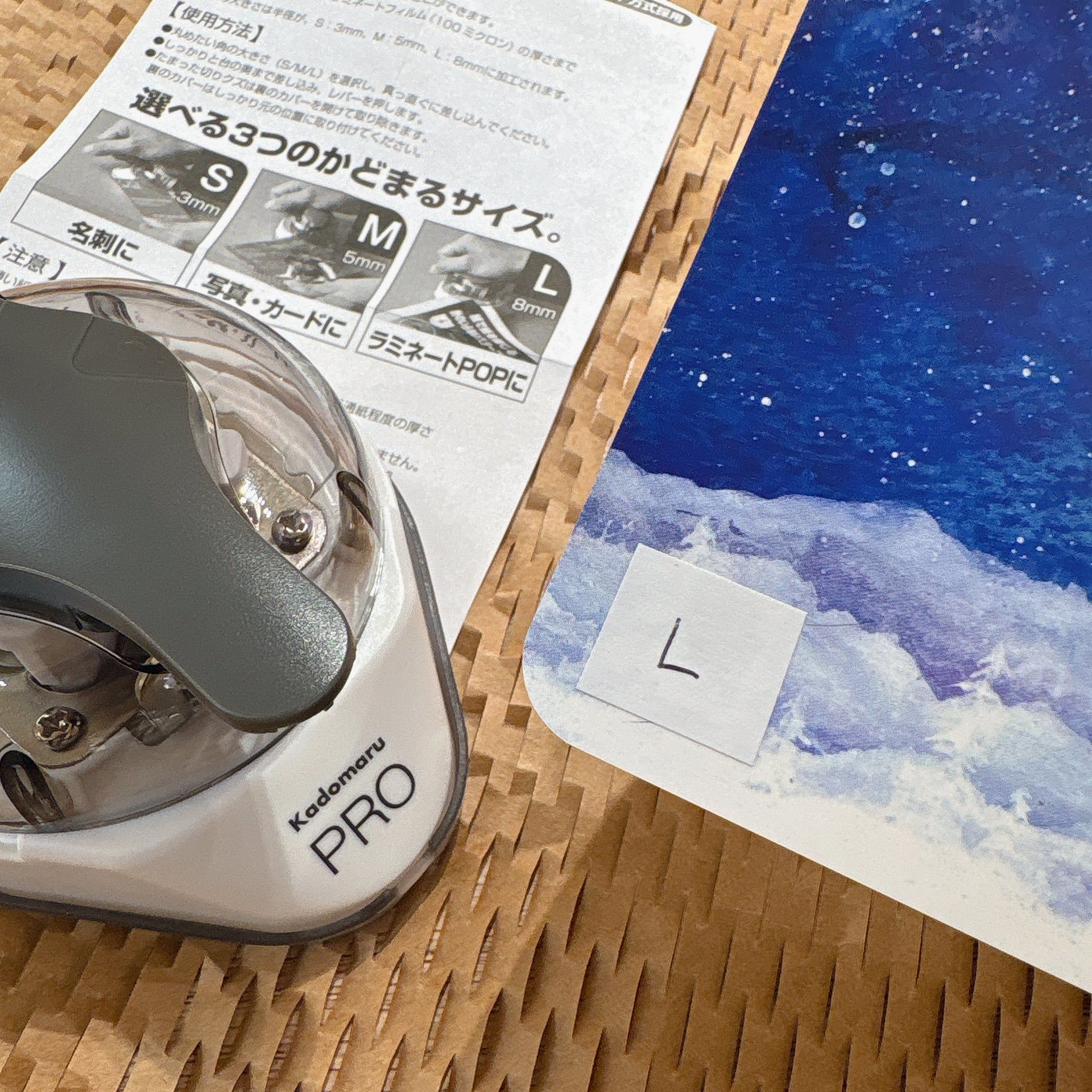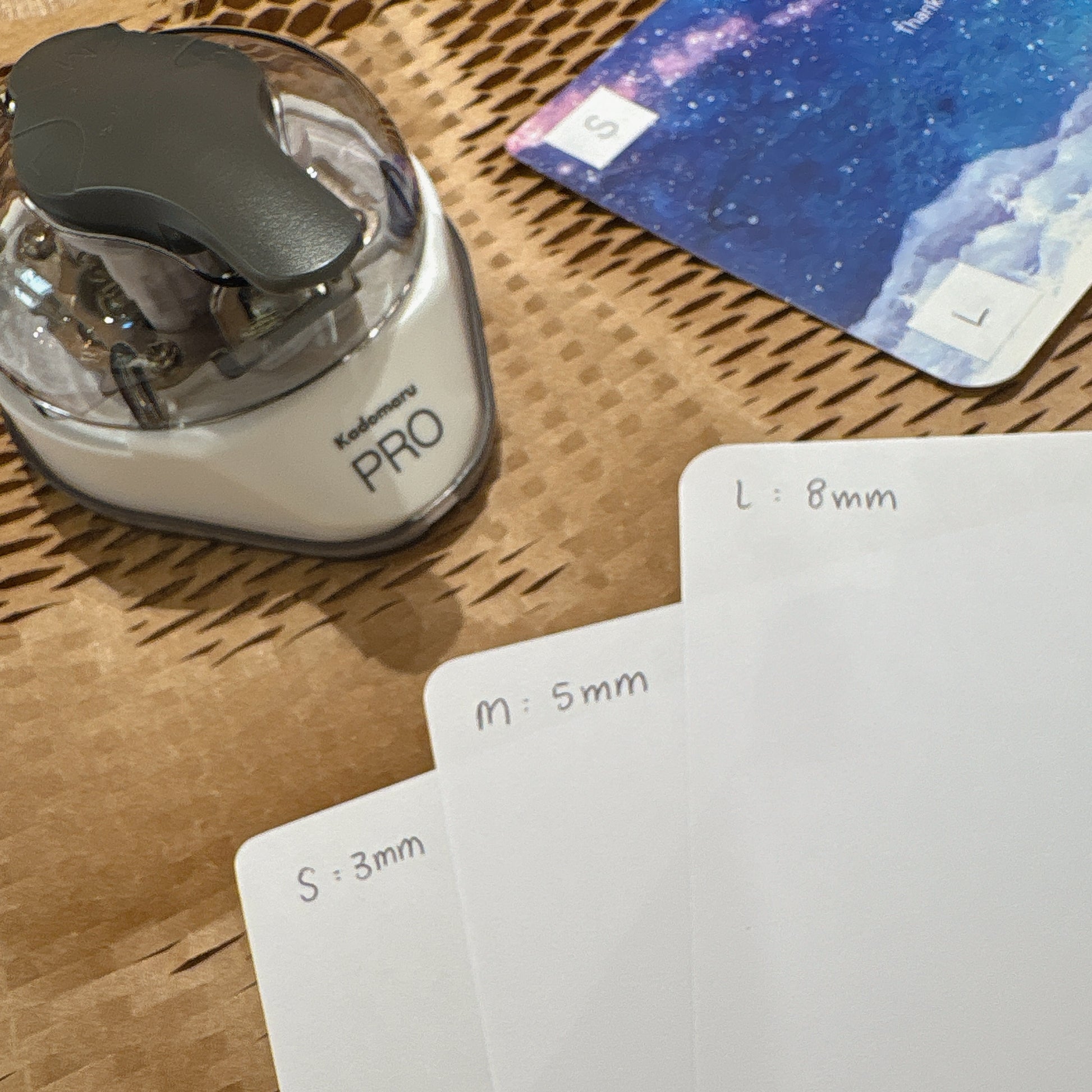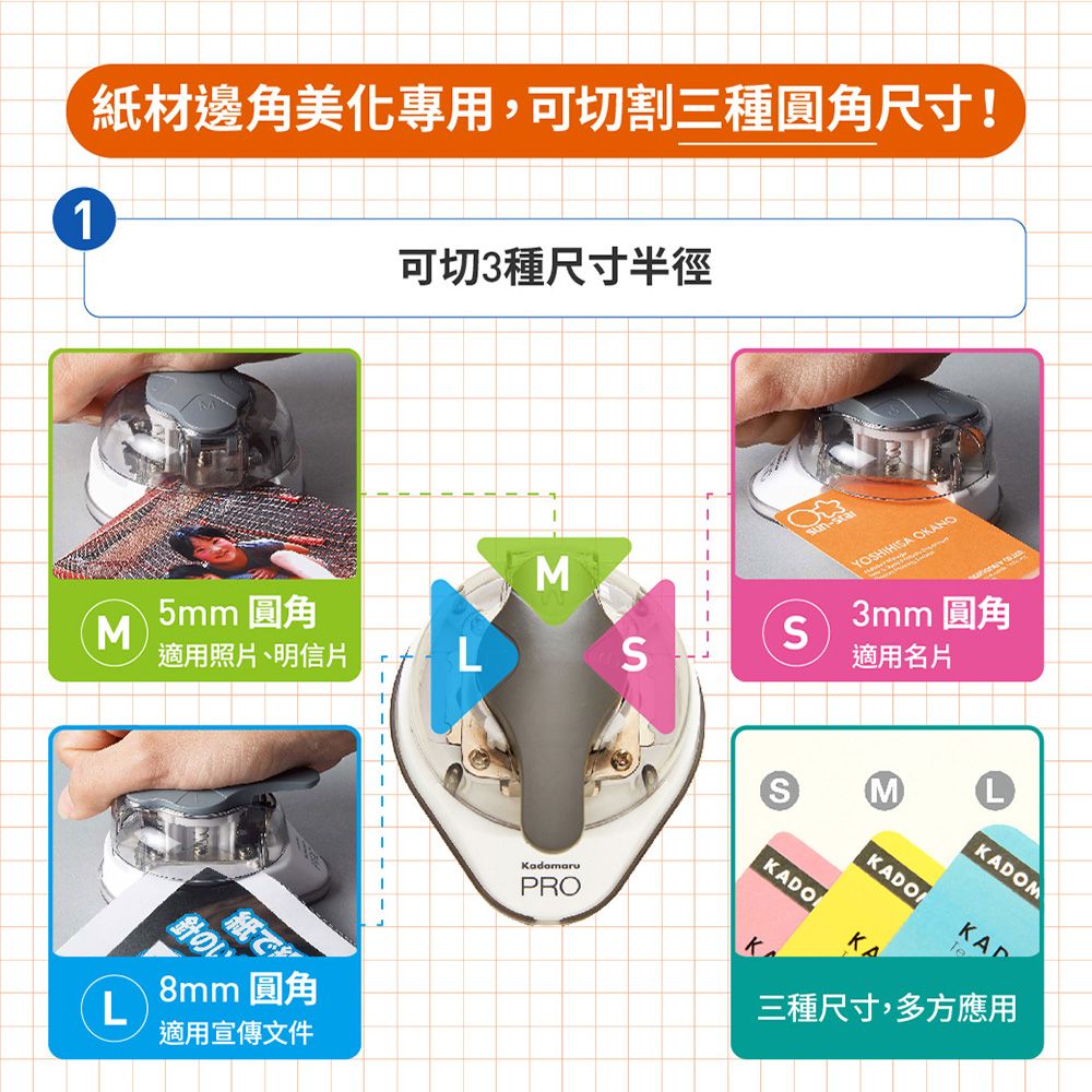 有大中小三種尺寸的圓角裁剪器,只要選擇好你想要的圓角尺寸,然後將紙張直角部位放入圓角器裁剪處,按下手把就能切出完美半徑圓角。