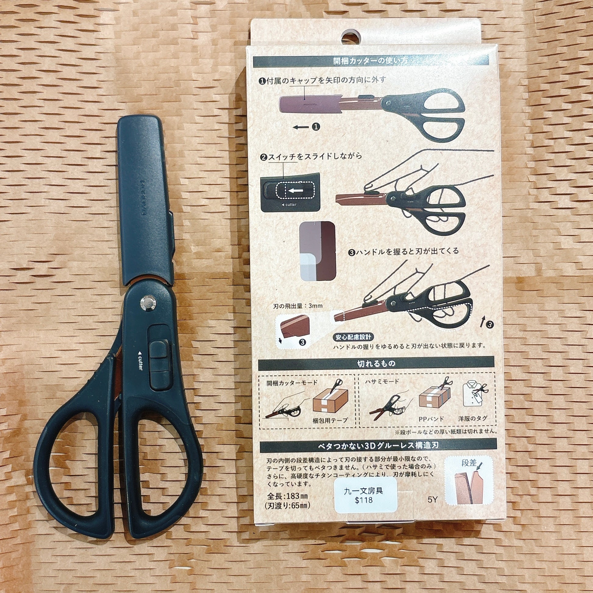 一把剪刀兩種用法。剪刀上方有安全掣,向前推令刀鋒露出,即可當開箱刀使用。不論是一般使用還是開箱時用也超級方便!而且,刀刃最多只能伸出 1 mm ,在𠝹開封箱的膠紙時,不會擔心會刀刃太長,會𠝹到箱入面物品而有損壞,鬆手即回復剪刀模式,十分之安全呢!