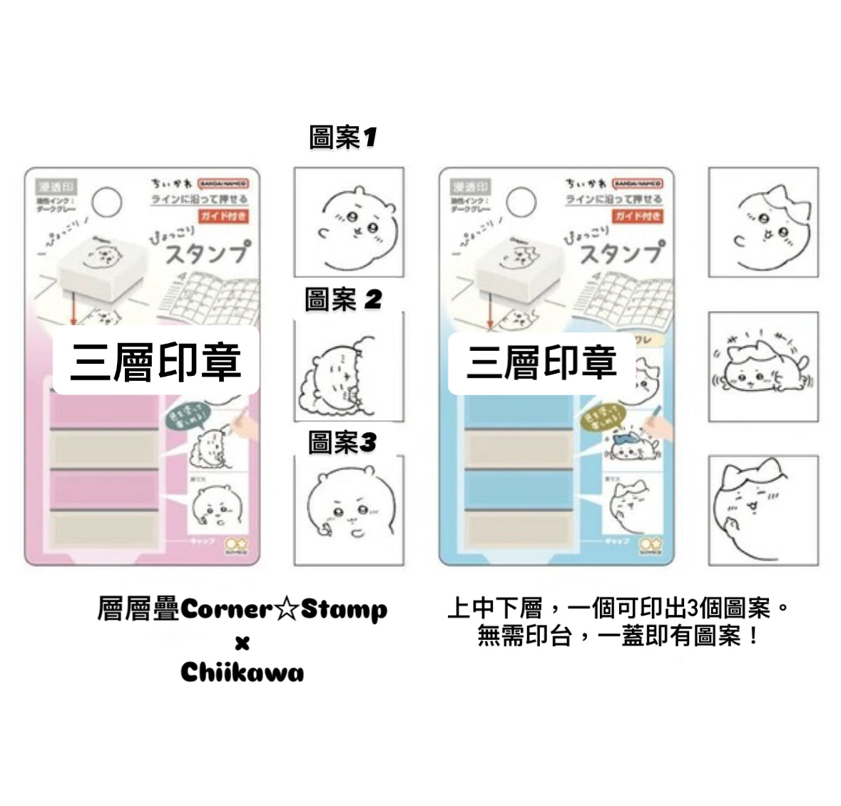 一個3層的Chiikawa 印章,自帶墨水,無需印台!發揮大家的創意和心思,把可愛的Chiikawa 們藏在不同的角落!